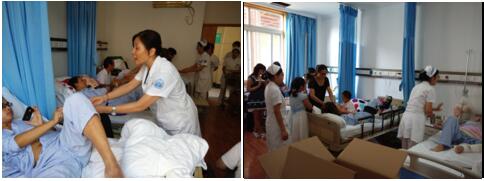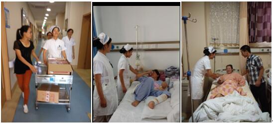 秋高气爽,阳光和煦。9月26日下午13点,在这个节日气氛浓郁的中秋前夕,在上海虹桥医院领导的关心和安排下,支部委员、护理部主任田方培,工会、行政部主任徐晨晨,医保办盛老师等与病房护士,首先来到医院病房看望了正在住院的病人,给他们送去了老大房月饼和节日的祝福,祝福他们节日快乐、早日康复!一位独自在病房过中秋的大姐感动地流泪。